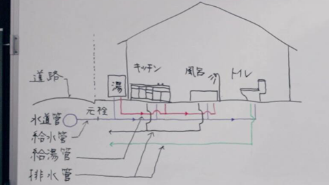 こちらの水道管から、水を引き込む管が給水管といいます。この給水管が、キッチンやお風呂やトイレにつながっています。